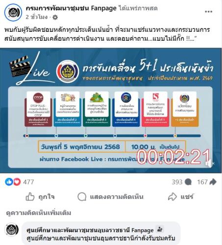 ในการถ่ายทอดสดครั้งนี้ นายสุรศักดิ์ อักษรกุล อธิบดีกรมการพัฒนาชุมชน ให้เกียรติกล่าวเปิดรายการ และบรรยายพิเศษในหัวข้อ