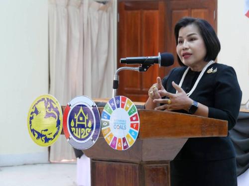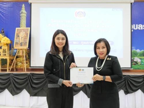 นางนวลจันทร์ ศรีมงคล ผู้ตรวจราชการกรม ปฏิบัติหน้าที่ผู้อำนวยการศูนย์ศึกษาและพัฒนาชุมชนอุบลราชธานี ประธานปิดโครงการสร้างความรู้ความเข้าใจเกี่ยวกับ ระบบบริหารการจัดการสำนักงาน (e-Office) กรมการพัฒนาชุมชน