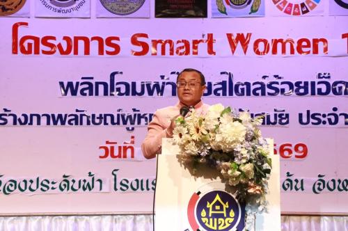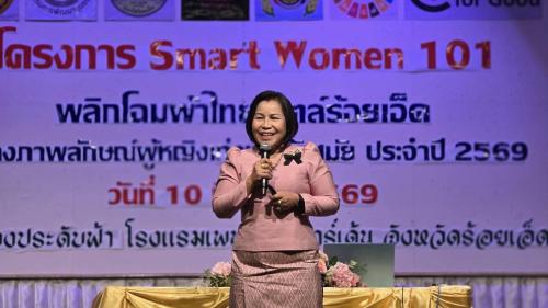 นางนวลจันทร์ ศรีมงคล ผู้ตรวจราชการกรม ปฏิบัติหน้าที่ผู้อำนวยการศูนย์ศึกษาและพัฒนาชุมชนอุบลราชธานี ร่วมขับเคลื่อนพลังสตรี บรรยายพิเศษการดำเนินงานกองทุนพัฒนาบทบาทสตรี ในเวที Smart Women 101 พลิกโฉมผ้าไทยสไตล์ร้อยเอ็ด เสริมพลังสตรีสู่ความทันสมัย เนื่องในวันสตรีสากล 2569