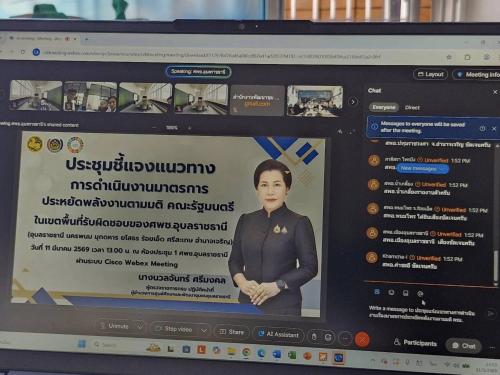 นางนวลจันทร์ ศรีมงคล ผู้ตรวจราชการกรม ปฏิบัติหน้าที่ผู้อำนวยการศูนย์ศึกษาและพัฒนาชุมชนอุบลราชธานี เป็นประธานการประชุมชี้แจงแนวทางการดำเนินงานตามมาตรการประหยัดพลังงานภาครัฐ ตามมติคณะรัฐมนตรี เมื่อวันที่ 11 มีนาคม 2569 เพื่อสื่อสารแนวทางการดำเนินงานแก่สำนักงานพัฒนาชุมชนในพื้นที่รับผิดชอบ 7 จังหวัด ได้แก่ อุบลราชธานี อำนาจเจริญ ยโสธร ร้อยเอ็ด ศรีสะเกษ นครพนม มุกดาหาร และอำนาจเจริญ